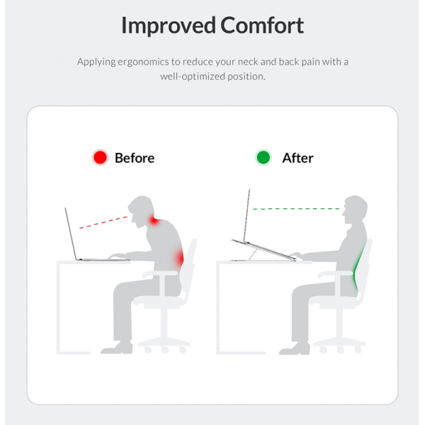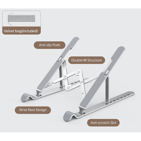 Η επιφάνεια τοποθέτησης του laptop είναι επικαλυμμένη από αντιολισθητικό υλικό σιλικόνης ώστε να μην γλιστράει η συσκευή και διαθέτει foldable σχεδιασμό για να καταλαμβάνει πολύ μικρό χώρο, όταν δεν χρησιμοποιείται.