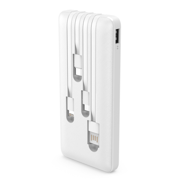 Διαθέτει 1 θύρα εξόδου USB και 3 ενσωματωμένα καλώδια εξόδου USB-C (εξόδου/εισόδου), Lightning και Micro USB με συνολική απόδοση φόρτισης έως 10.5W. Το power bank φορτίζει μέσω της θύρας εισόδου Micro USB και των ενσωματωμένων καλωδίων USB και USB-C.
