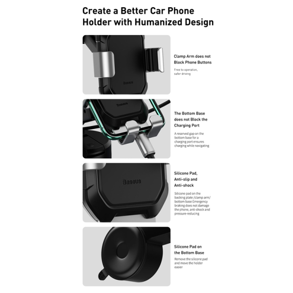 Κατασκευασμένη από ανθεκτικό πλαστικό και αλουμίνιο, η βάση αυτοκινήτου Tank Gravity διακρίνεται για το εκλεπτυσμένο design της. Ασφαλίζει το smartphone με έναν έξυπνο μηχανισμό συγκράτησης, ο οποίος λειτουργεί με το βάρος της ίδιας της συσκευής και προσφέρει άμεση και ταχύτατη εισαγωγή/εξαγωγή της συσκευής με το ένα χέρι. Τα μετακινούμενα πτερύγια της είναι κατασκευασμένα από αλουμίνιο και είναι επενδυμένα από αντιολισθητικό, μαλακό υλικό, ώστε να βελτιώνεται το επίπεδο συγκράτησης, αποτρέποντας τις γρατσουνιές από την χρήση. Διαθέτει τηλεσκοπικό βραχίονα με προσαρμόσιμη γωνία 180° και ειδικό κλιπ πίσω από τη βάση στήριξης του smartphone επιτρέπει την μετακίνηση προς κάθε κατεύθυνση, ώστε να μπορεί να προσαρμοστεί στην ιδανική γωνία θέασης. Στερεώνεται στο αυτοκίνητο σε οποιαδήποτε επίπεδη επιφάνεια μέσω μιας πολύ ισχυρής βεντούζας.