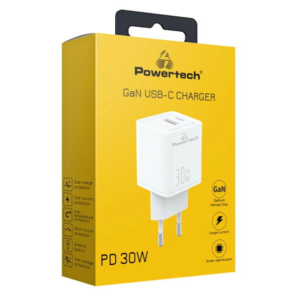 Charger PT-1093, USB-C, PD 30W, GaN, λευκός Specifications: Input: AC 100-240V, 50/60Hz, 1.2A Max